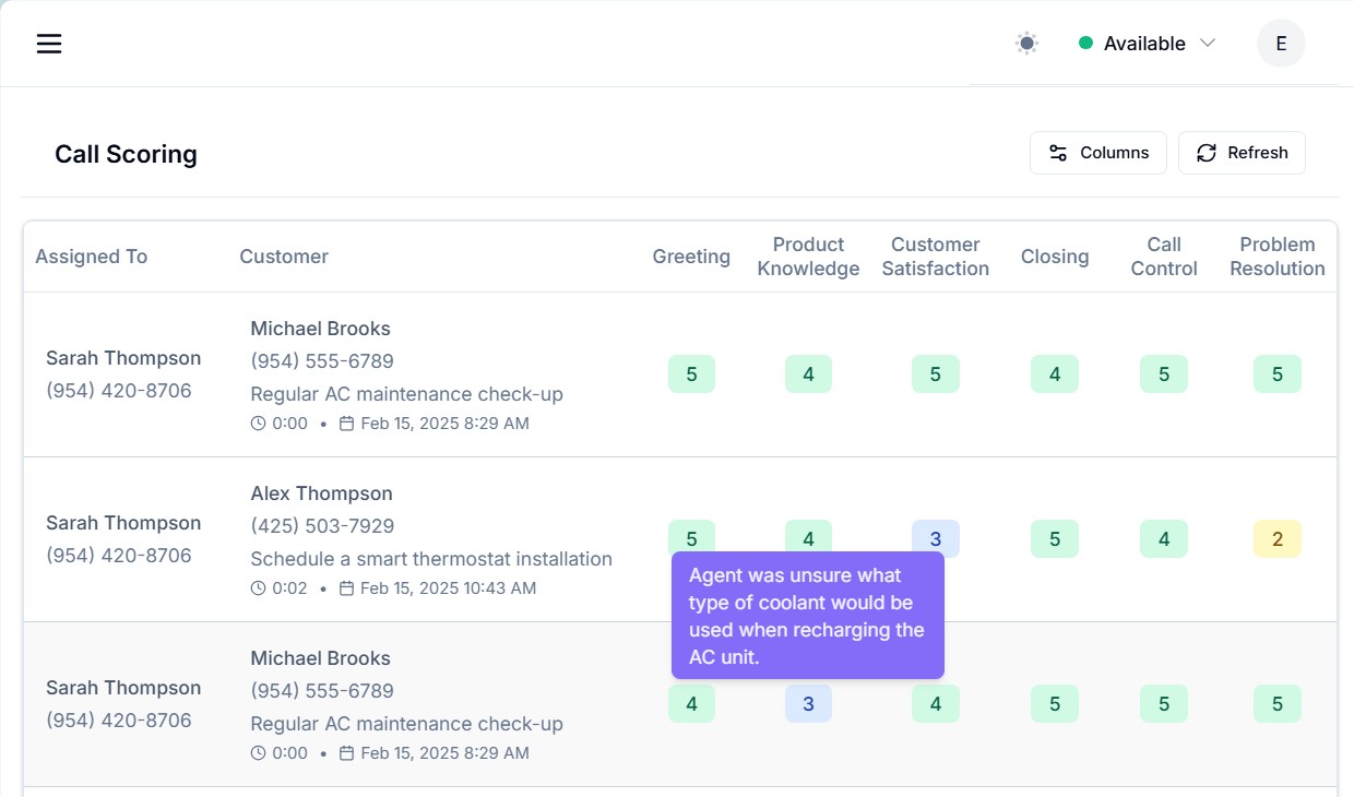Every call is automatically recorded, transcribed, and scored to help you maintain consistent service quality and identify coaching opportunities.